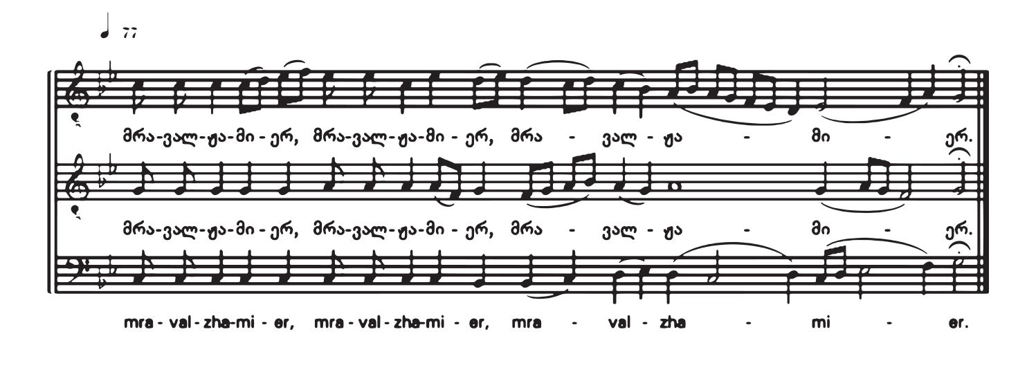 The word mravalzhamieri refers to both a kind of table song and at the same time a church hymn. The combination of two words—mravali (many) and zhami (time)—is interpreted as: many times, very long. At the end of the divine liturgy, the singes often sing in a church a version of mravalzhamieri from some part of Georgia (audio example).