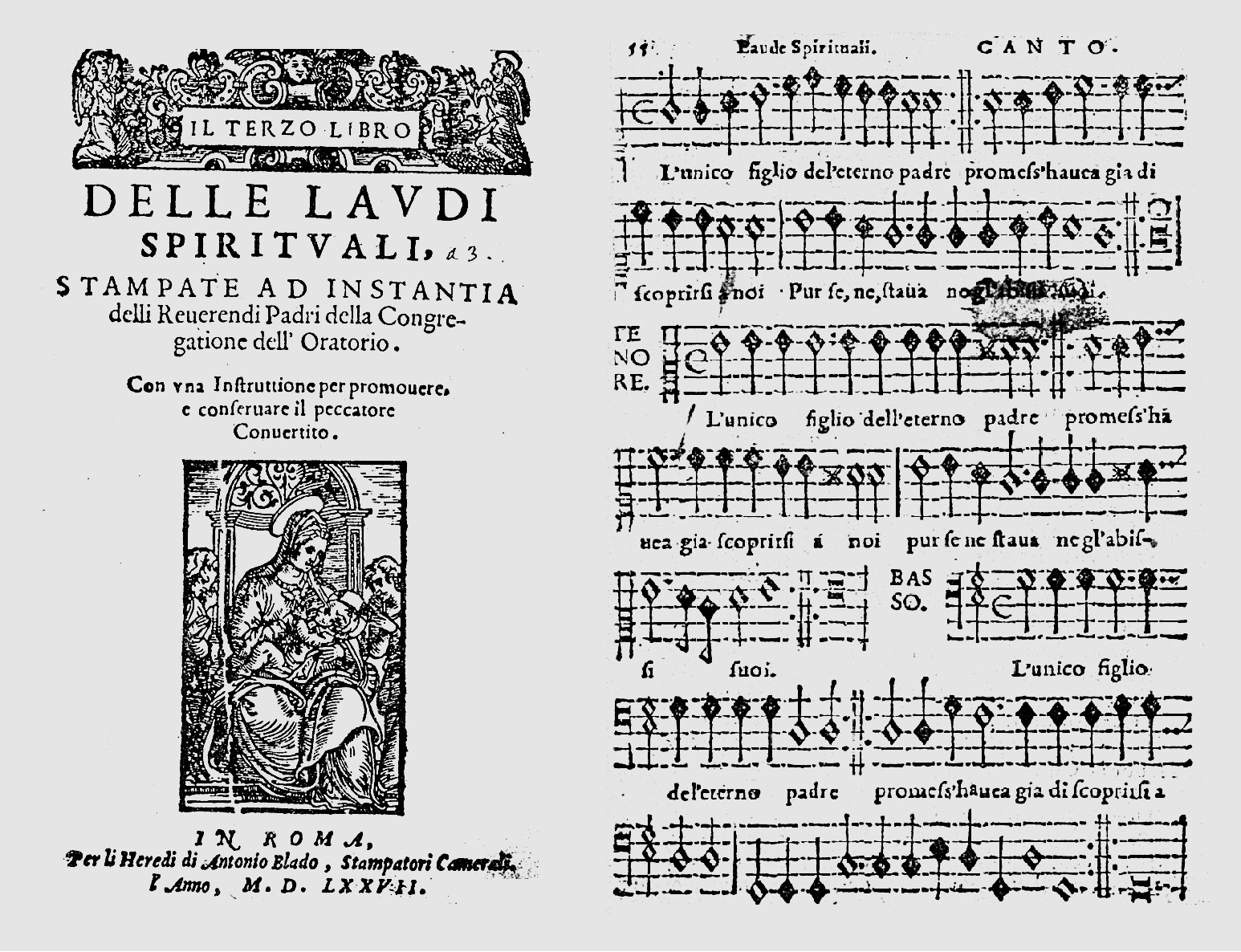 Il terzo libro delle laudi spirituali, stampate ad instantia delli Reverendi Padri della Congregatione dell’Oratorio. Con una instruttione per promuovere, e conservare il peccatore convertito, Roma, eredi di Antonio Blado, 1577.