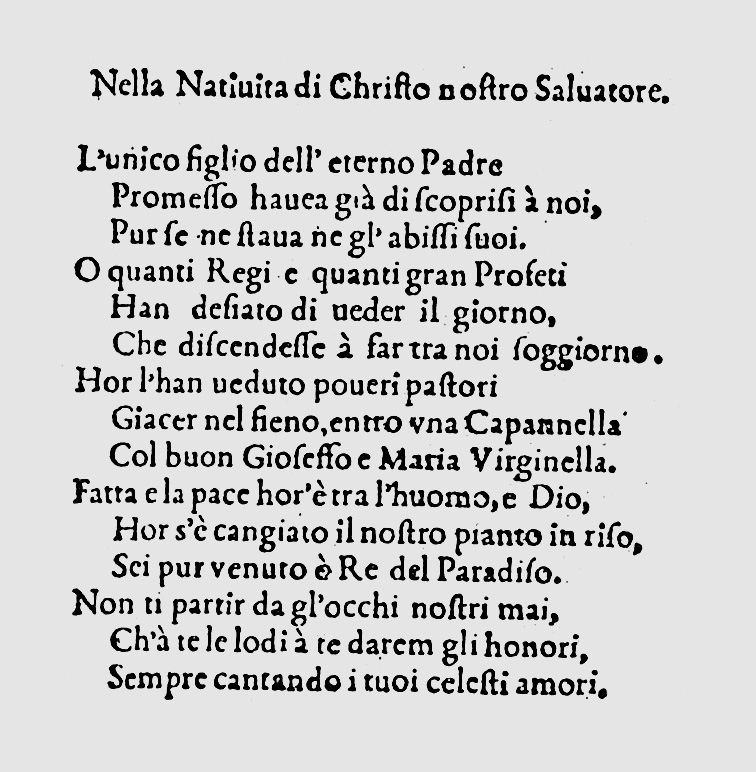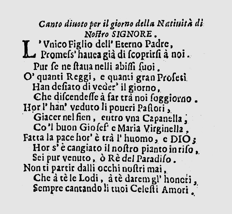 ეს სიმღერა გამოქვეყნდა მიჩის კრებულში „Canto divoto per il giorno della Natività di Nostro Signore“ („საშობაო დღის რელიგიური სიმღერა“), სათაურით „L'unico figlio dell'eterno padre“ („მარადი მამის ერთადერთი ძე“).