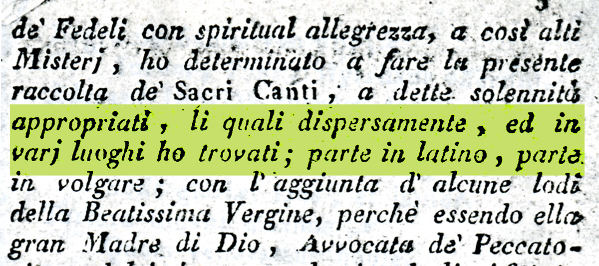 ამგვარად, მიჩიმ, სავარაუდოდ, სიმღერების ტექსტები მანამდე არსებული ხალხური ტრადიციიდან მოიპოვა. შესაძლოა სულაც მანამდე ნაბეჭდი წყაროებიდან ამოკრიფა. საბოლოო ჯამში, მან შეიძლება ორივე ხერხი გამოიყენა და გზადაგზა საკუთარი შეხედულებისამებრ შეავსო და ჩაასწორა. ბოლონიის კონსერვატორიის, რომში Vallicelliana-სდა ლონდონში ბრიტანეთის ეროვნულ ბიბლიოთეკებში მიზანმიმართულმა კვლევამ საშუალება მომცა გამომერჩია რამდენიმე წყარო მიჩის კოლექციიდან. ეს წყაროები ნაწილობრივ იყო დიდი მუსიკალურ-სასულიერო ძვრებისა და ცვლილებების შედეგი ტრიენტის საეკლესიო კრების ხანაში (1545–1563), რომლის ერთ-ერთ ყველაზე მნიშვნელოვან მუსიკალურ მიღწევას წარმოადგენდა სასულიერო ტექსტებზე აგებული საერო მუსიკა, რომელიც იტალიურად ცნობილია, როგორც „laudi a travestimento spirituale“. ამ პროცესის ცენტრალური ფიგურები იყვნენ კარლო ბორომეო და მღვდელი სერაფინო რაცი, რომლებიც კრების პერიოდში ექვსი წლის განმავლობაში ხელმძღვანელობდნენ მღვდელ მუსიკოსთა კომისიას, რომლებიც თხავზდნენ სიმღერებს. შემოქმედებითი პროცესი სასულიერო ტექსტების ფართოდ ცნობილ პოპულარულ ჰანგებზე ადაპტირებას გულისხმობდა.