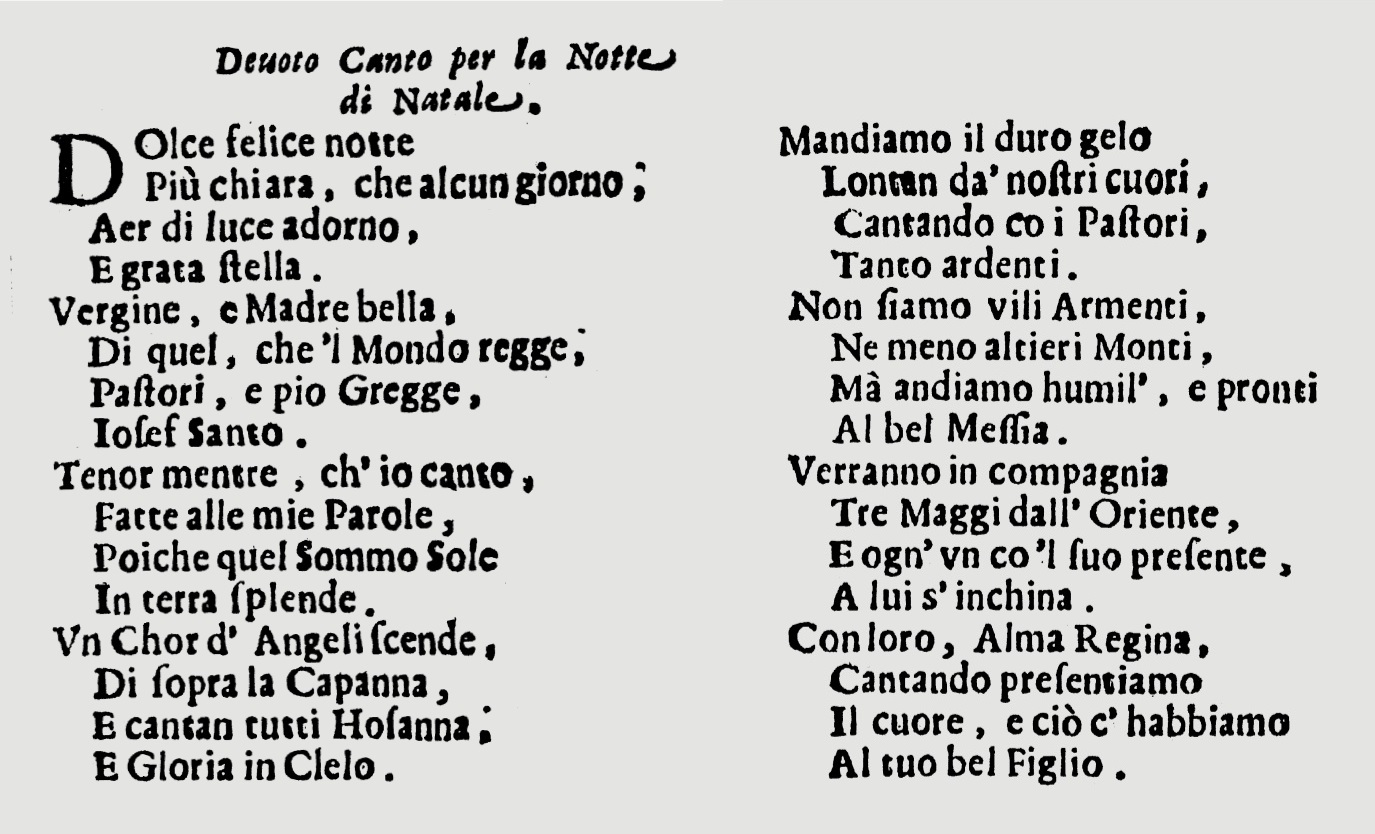 ეს სიმღერა გამოქვეყნდა მიჩის კრებულში სათაურით „Divoto Cantico per la notte di Natale“ (შობის ღამის რელიგიური სიმღერა), რომელიც იწყება სიტყვებით: „Dolce felice notte“ („ოჰ, სიხარულით აღსავსე ბედნიერი ღამე“).