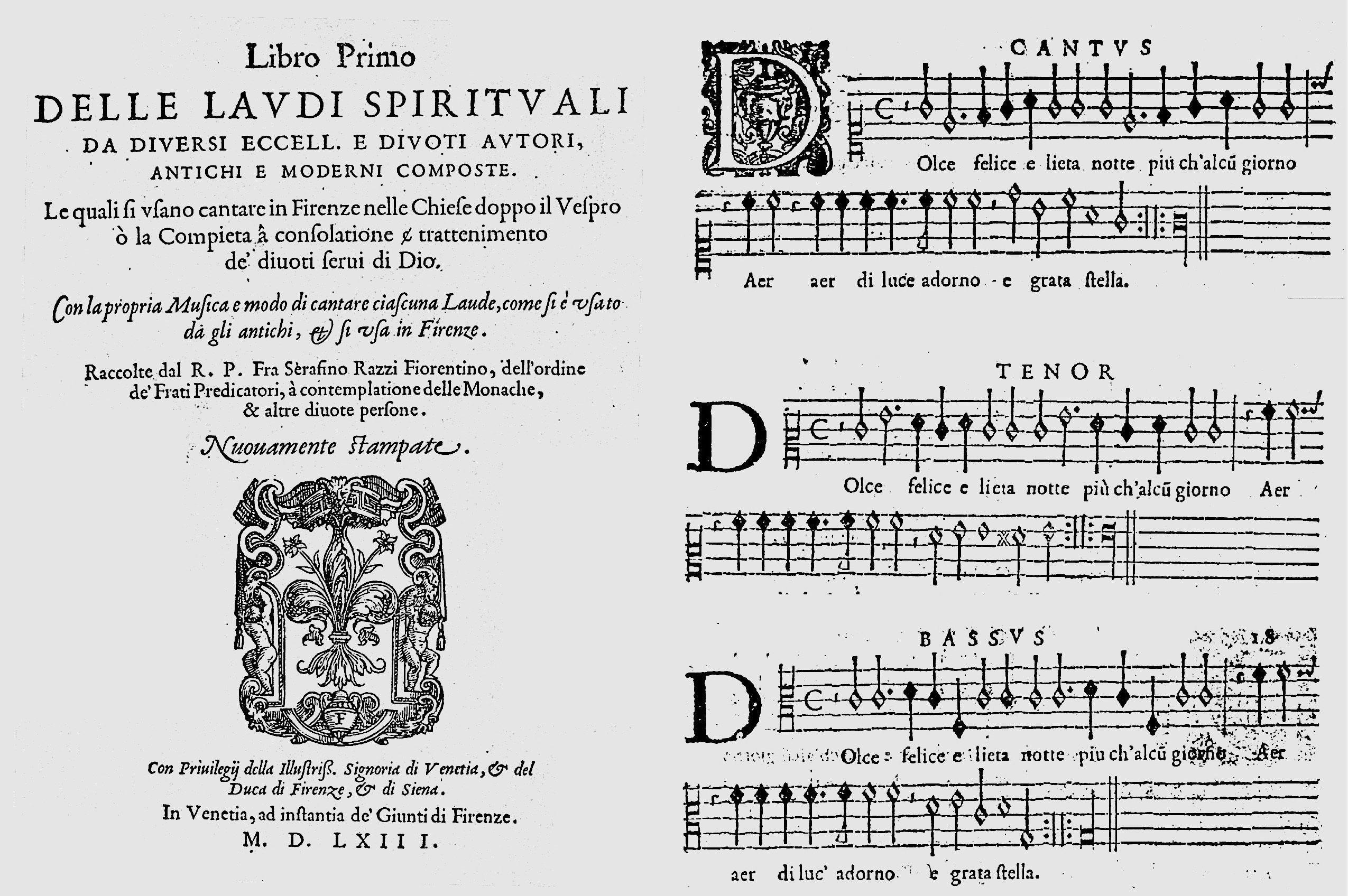 Serafino Razzi, Libro primo delle laudi spirituali da diversi eccell. e divoti autori, antichi e moderni composte. Le quali si usano cantare in Firenze nelle chiese doppo il Vespro ò la Compieta [...]. Con la propria musica e modo di cantare ciascuna laude, come si è usato da gli antichi, et si usa in Firenze. Raccolte dal R. P. Fra Serafino Razzi fiorentino, dell’ordine de’ Frati Predicatori [...]. Nuovamente stampate, Venezia, Giunti, 1563 (Francesco Rampazetto).