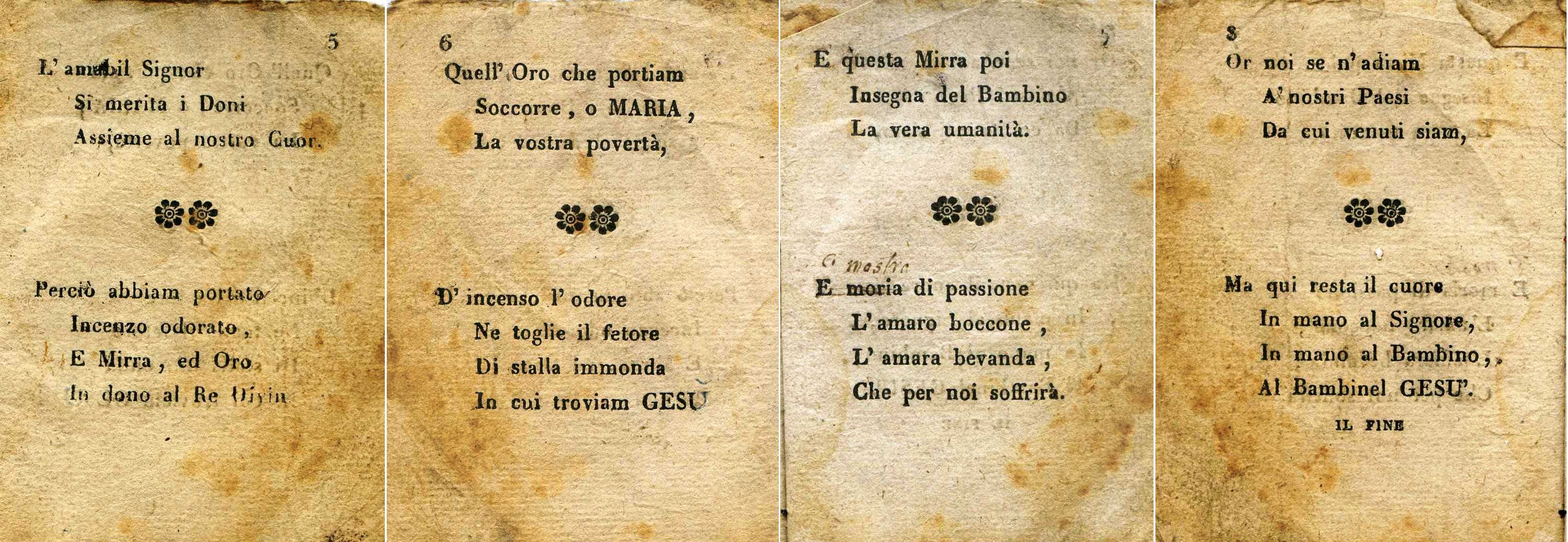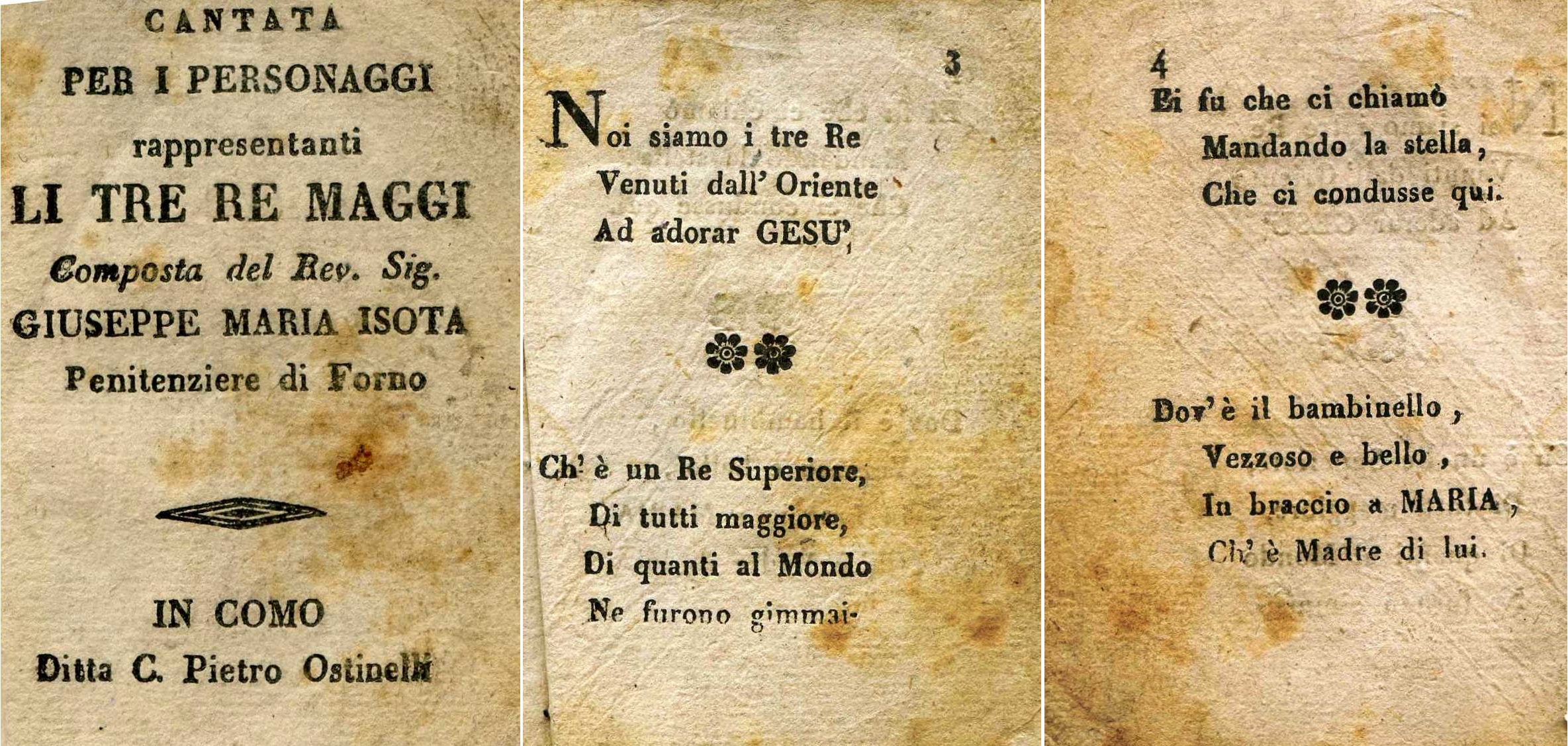 ამ შემთხვევაშიც, სატიტულო გვერდზე არ არის მითითებული გამოცემის თარიღი, მაგრამ მიუთითებს გამომცემელსა (პიერო ოსტინელი) და ავტორს – ღირსი ჯუზეპე მარია იზოტა, ფორნოელი „მომნანიებელი“ (აღმსარებელი). თავისი ჩვეული აკურატულობითა და ოსტატობით, პროფესორმა ბელატიმ ასევე მოახერხა 1732 წელს დაბადებული და 1794 წელს გარდაცვლილი მღვდლის ბიოგრაფიის რეკონსტრუქცია. პირველად, სწორედ პრემანაში ნაპოვნი ამ დოკუმენტის წყალობით, შესაძლებელი გახდა არა მხოლოდ დაესახელებინათ ალპებში ყველაზე გავრცელებული საშობაო სიმღერის ავტორი, არამედ დაედგინათ მისი შექმნის თარიღიც, ჩვენი „მომნანიებლის“ (აღმსარებლის) დეტალების წყალობით. „Noi siamo i tre Re“ ფაქტობრივად შეიქმნა 1759-1774 წლებში, როდესაც მამა ჯუზეპე მარია ისოტა იმყოფებოდა ფორნოში, ვალ სტრონაში, როგორც აღმსარებელი.