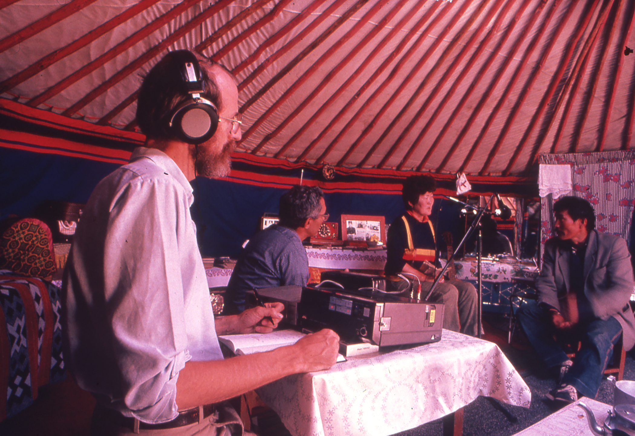 ტედ ლევინი ტუველი (ობერტონული) მომღერლების ჩაწერისას იურტაში, ტუვა. 1987